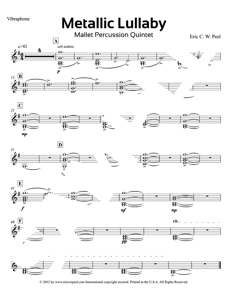 This quintet is written for Chimes, two-octave Crotales, two Glockenspiels, and standard Vibraphone. Need a different arrangement? See here.